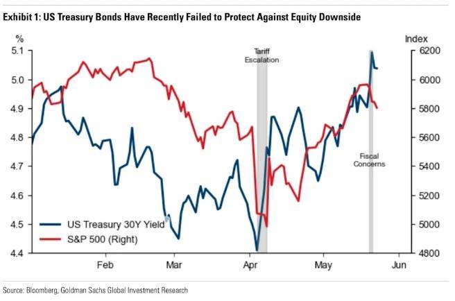 高盛分析师周三指出:“长期美国国债近期未能起到保护股市下行风险的作用,无论是四月初关税升级引发对美国经济治理和衰退风险的担忧时,还是上周长期借贷成本因财政可持续性忧虑而飙升之际,都是如此。”